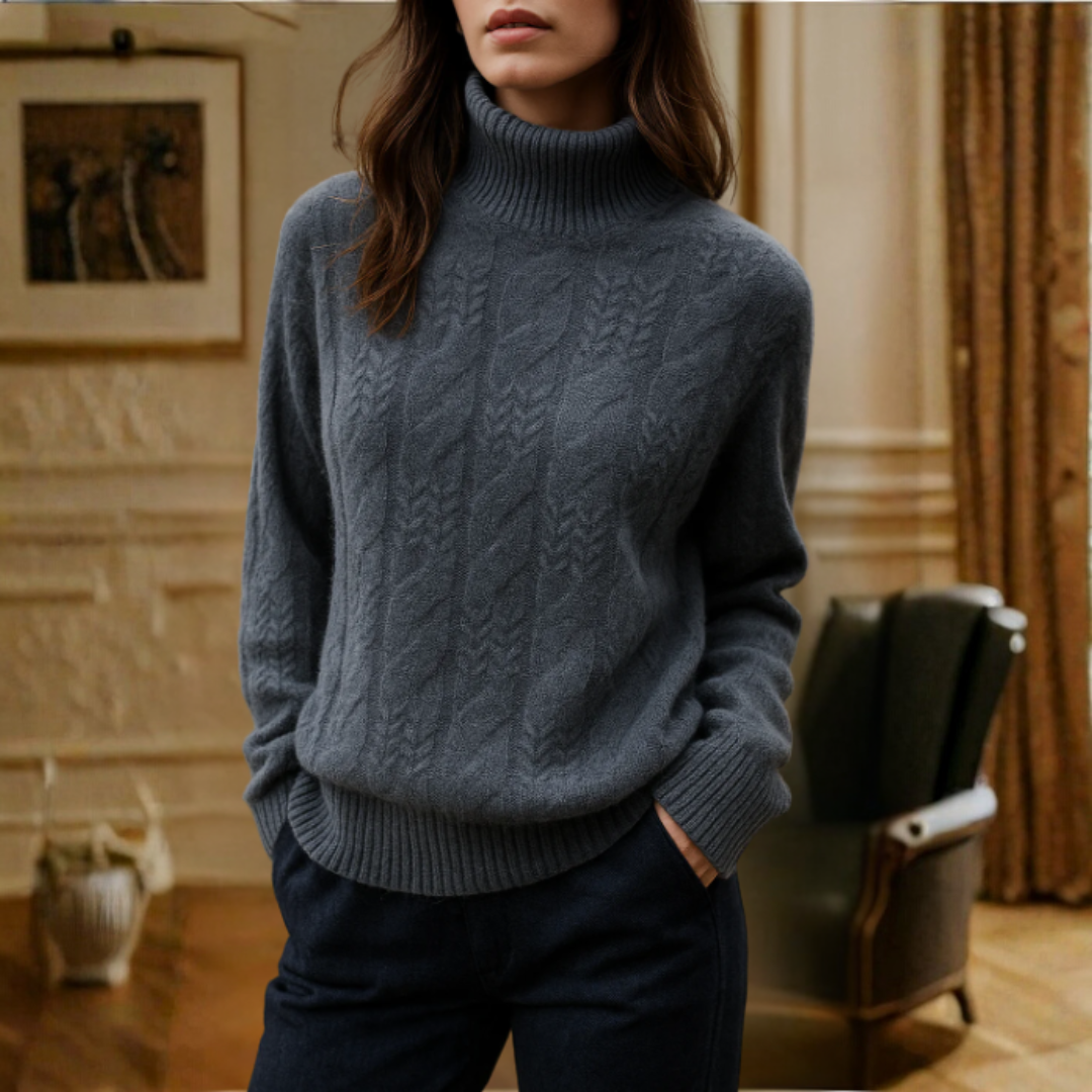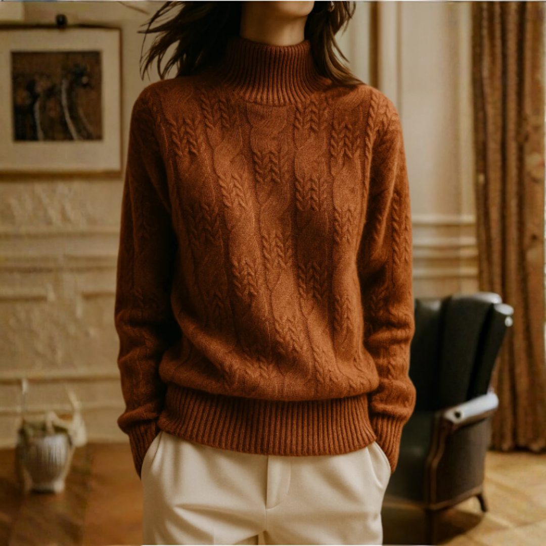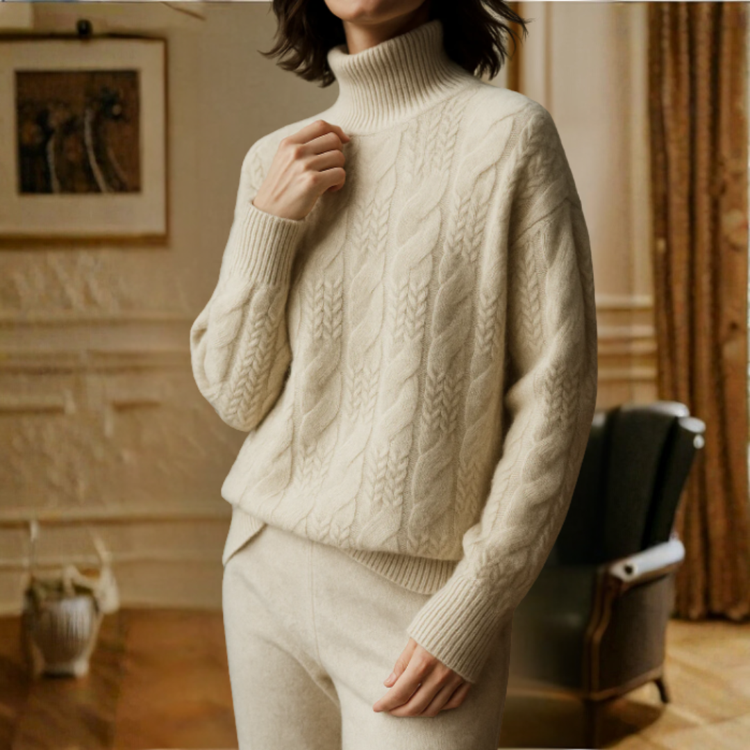 「ケーブルニットセーター」は、シンプルな中に洗練された魅力を秘めた一枚。やわらかな着心地とエレガントなシルエットで、日常をより心地よく彩ります。