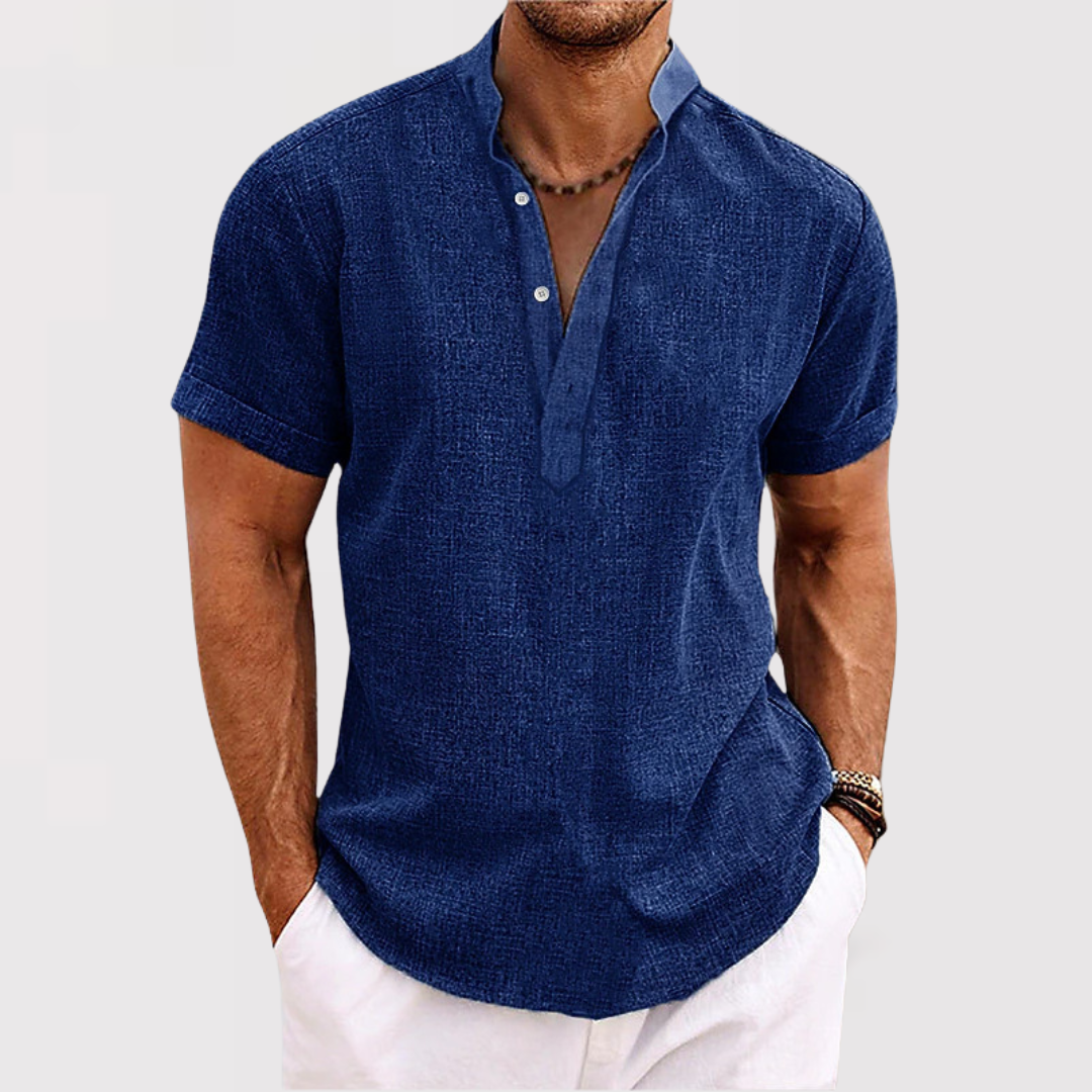 洗練されたスタイルを手軽に楽しめる、現代の男性のための半袖ヘンリーネックシャツ。